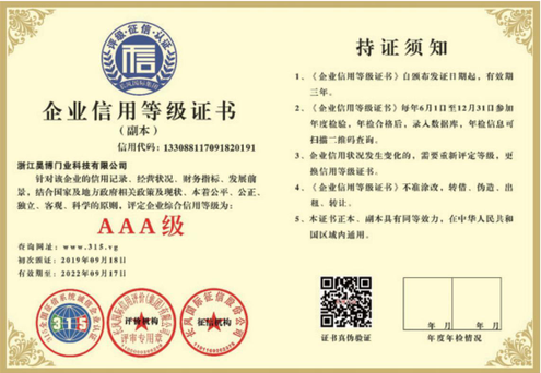 公司一直以來嚴格執行ISO9001質量體系和ISO14001環境管理體系標準,建立了完備的科研、開發、生產、銷售服務體系。公司是浙江省門業協會會員單位,江山門業協會理事單位,中國木材與木制品流通協會會員單位,江山市消防協會副會長單位。